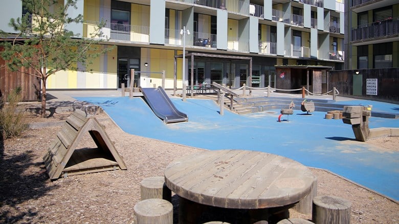 Förskolans entréer till avdelningarna är från innergården. Förskolans utemiljöer finns på innergården med tillgång till lekplats i den angränsande parken.