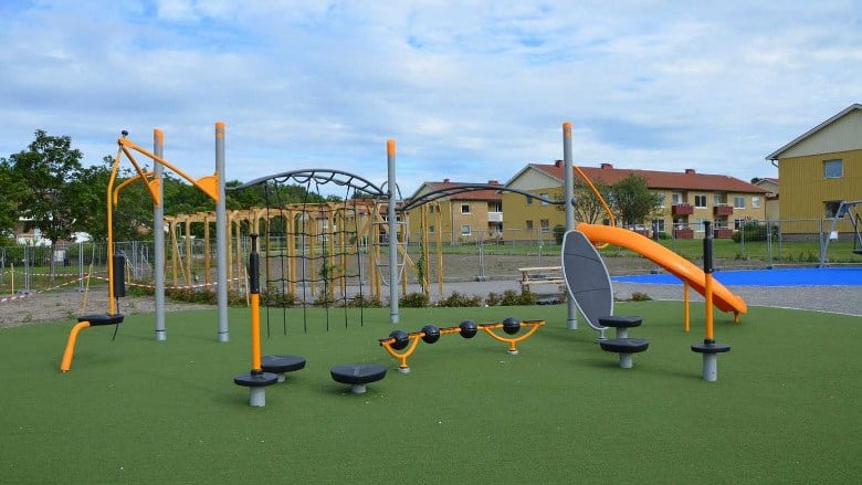 Under lekredskapen är det konstgräs därmed finns möjlighet för rullstolsburna att komma fram. Här finns även parkbänk och sopkärl.