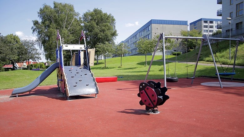 Lekplatsen ligger på Solhultsgatan, längs med Ytterbystigen, i Komarken, Kungälv.