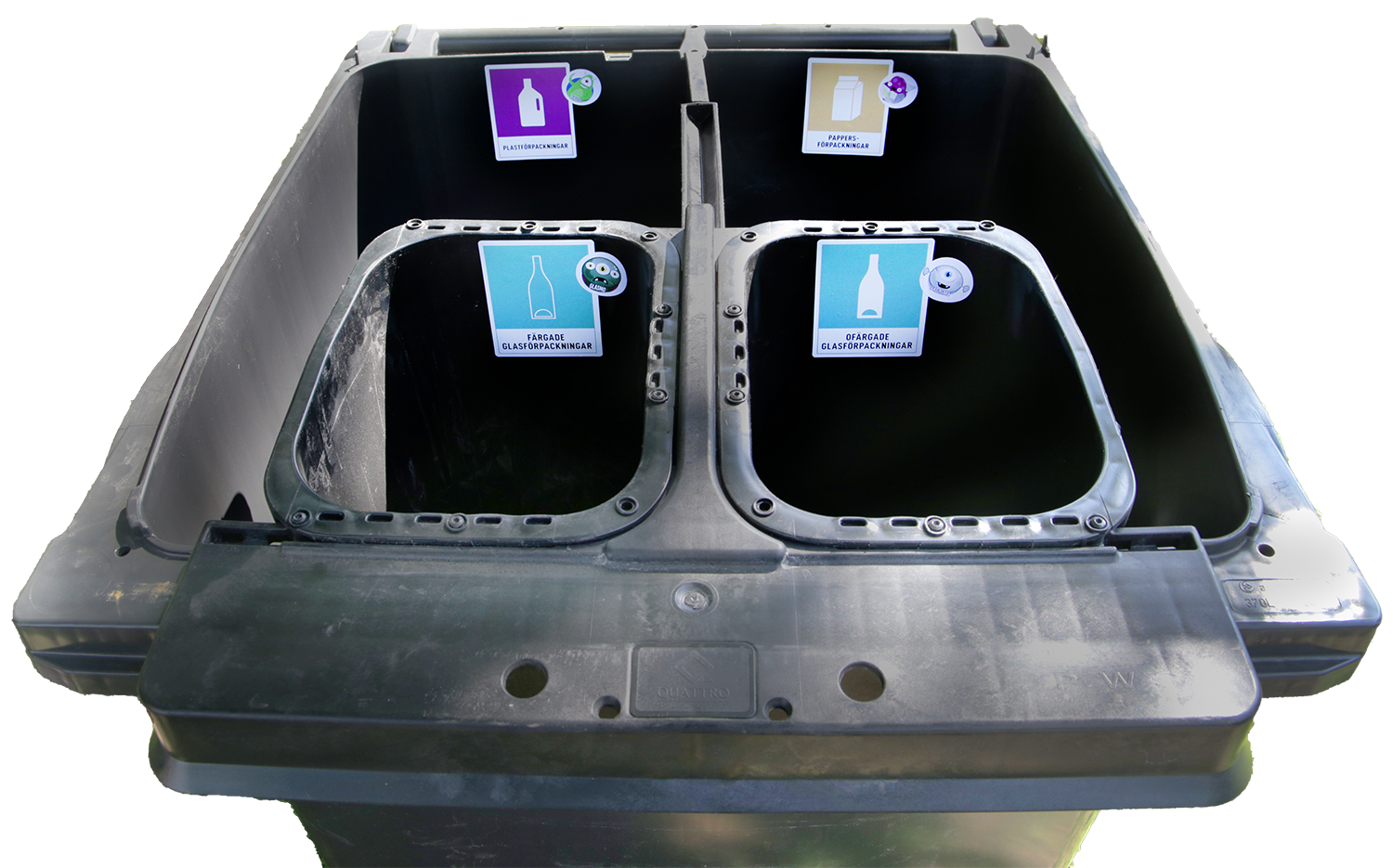 Fyrfackskärlet rymmer 370 liter och består av fyra fack. Här sorterar du plast- och pappersförpackningar, färgat och ofärgat glas. Det är viktigt att du lägger rätt avfall i rätt fack för att avfallet ska hamna rätt i sopbilen vid hämtning.