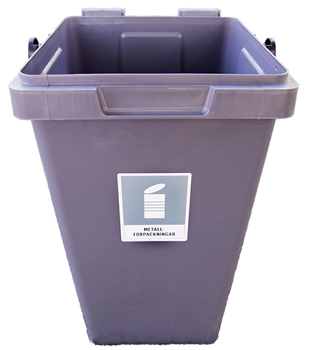 Den mindre behållaren för metallförpackningar rymmer 30 liter. Ställ fram behållaren för metallförpackningar vid de andra kärlen när det är dags för tömning.