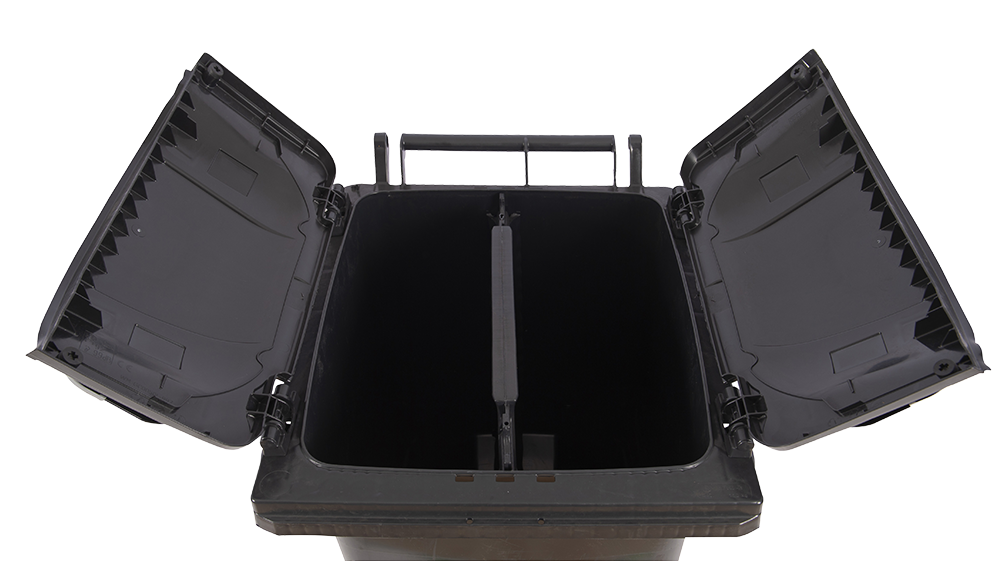 Tvåfackskärlen rymmer 240 liter och består av två fack. I ett kärl sorterar du plastförpackningar och färgat glas. I det andra kärlet sorterar du pappersförpackningar och ofärgat glas.