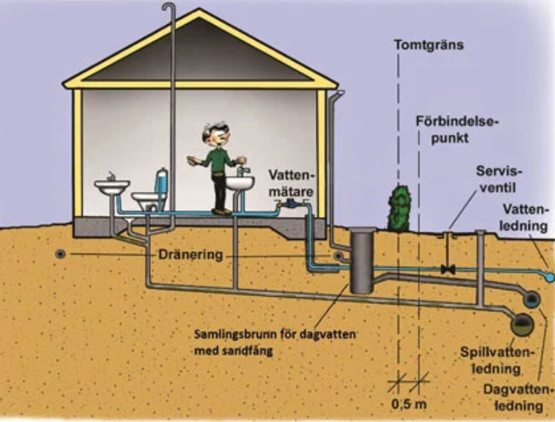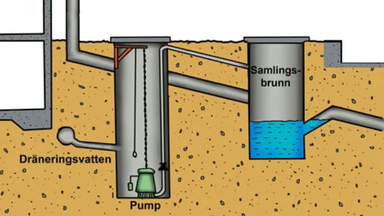 I ett hus med källare ska vattnet från stuprören i första hand ledas till en samlingsbrunn med sandfång och vattenlås för att sen anslutas till kommunens dagvattenledning. Om dräneringen ligger under det som kallas dämningsnivån* så behöver vatten därifrån pumpas upp till samlingsbrunnen.