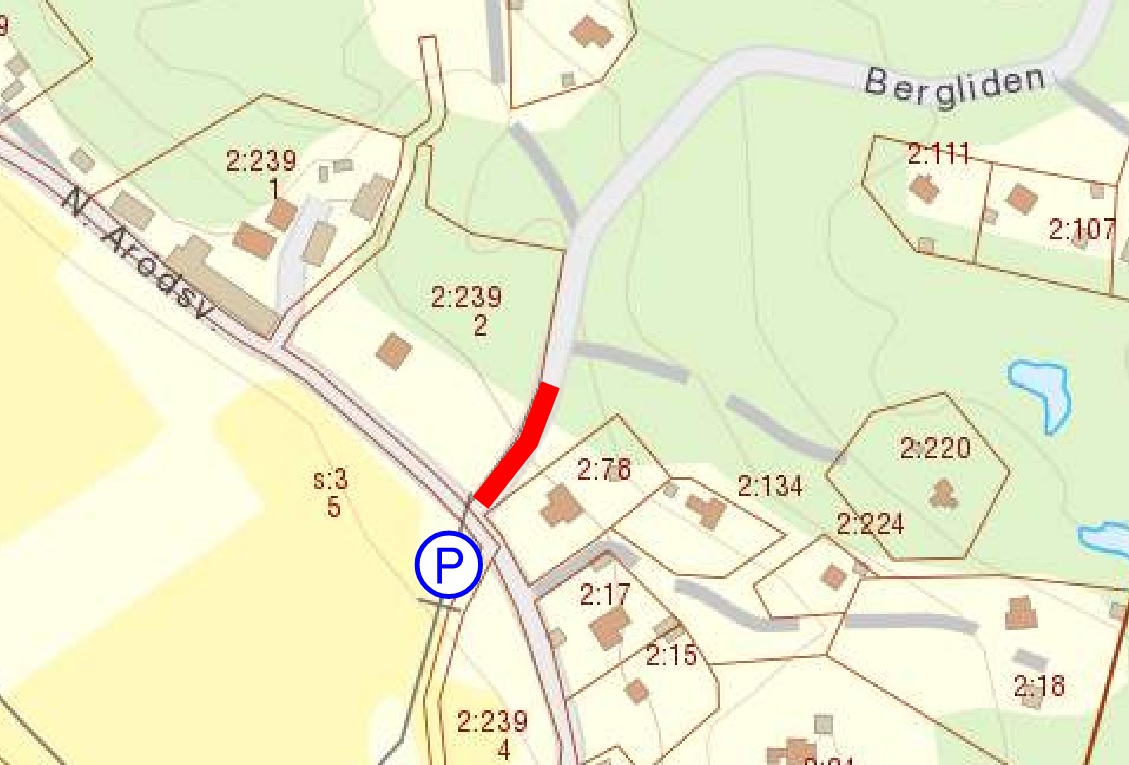 Med start onsdag 25 augusti kommer entreprenören att behöva utföra arbeten längst ned på Bergliden och framkomlighet med bil kommer då inte vara möjlig under arbetsdagen. Efter arbetsdagens slut, klockan 16:30, täcks schakt över och vägen blir åter körbar. Sedan öppnas schakten igen nästa dag när arbetena återupptas klocka 07:30. Under denna tid kommer det finnas parkeringsmöjligheter nedanför Bergliden enligt bilden nedan.