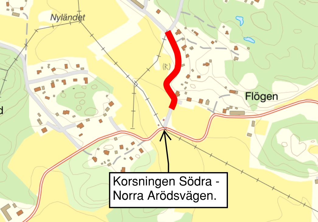 Entreprenadarbetet närmar sig färdigställande och nu planeras återställningsarbete. Under perioden 4 — 8 oktober kommer återställningsarbete att ske på Norra Arödsvägen, se aktuell sträcka med röd markering i bild nedan. Skador på vägen kommer att åtgärdas och asfaltering sker. Vägen kommer att vara avstängd under arbetstid klockan 08:00 — 16:00.