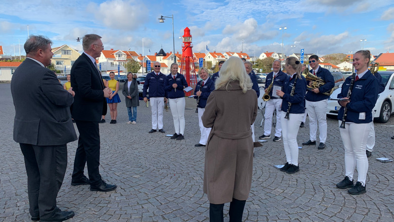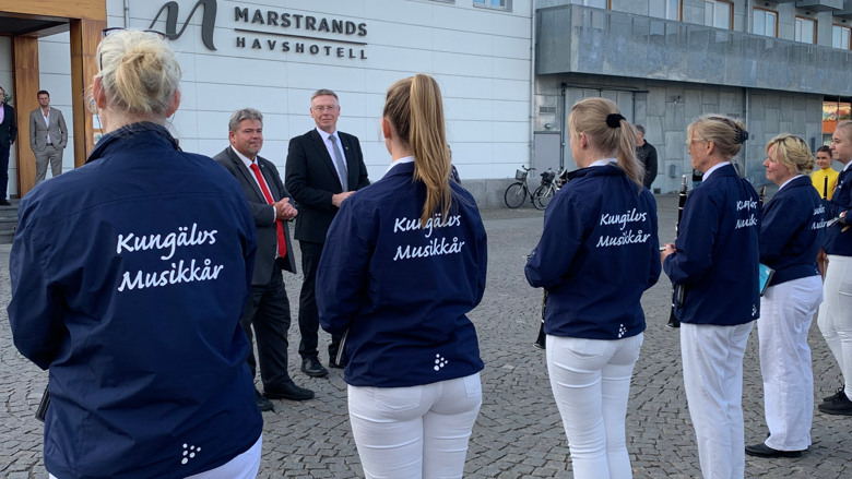 Bilderna: Hiddenhausens borgmästare Andreas Hüffmann och kommunstyrelsens ordförande Miguel Odhner (S) utanför Marstrands havshotell, när de fick lyssna och se på Kungälv Musikkår och Kungälvs Drillflickor.