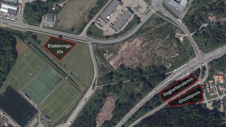 I den första fasen ordnas etableringsytor och dagvatten- samt groddammar anläggs, samtidigt som infrastrukturarbeten påbörjas. Området förbereds för framtida byggnader, vägar och ledningar genom schaktning, markjusteringar och ledningsdragningar för el, vatten och avlopp.