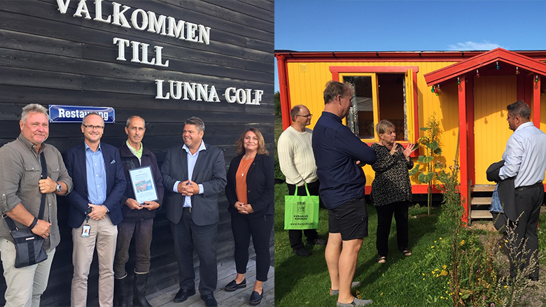 Bilder: Utanför Lunna Golf & Country Club står Kent Edvall jobbmatchare, Kent Jellmund näringslivsstrateg, Robert Heyman-ägare av Lunna Golf & Country Club, Miguel Odhner kommunstyrelsens ordförande och Lena Arnfelt sektorchef Trygghet och stöd.