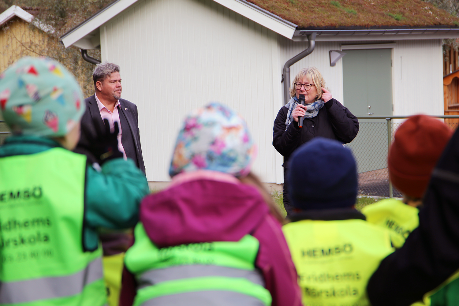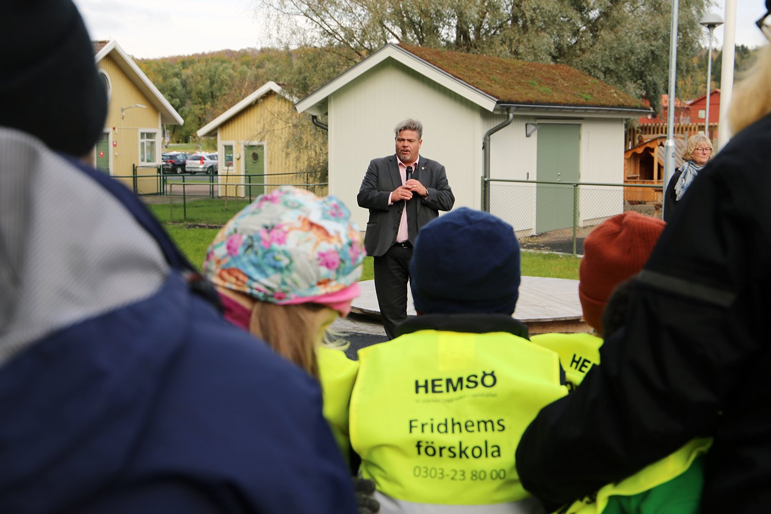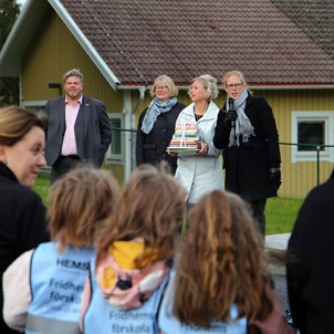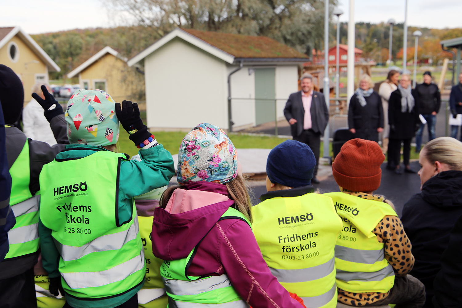 Ute på gården vid Fridhems förskola samlades barn och vuxna i den friska oktoberluften under tisdagen för att officiellt inviga förskolans nya huvudbyggnad. Bandet klipptes under högtidliga former av Miguel Odhner (S), kommunstyrelsens ordförande och Anna Vedin (M), ordförande i utskottet för bildning och lärande. Förskolan invigdes också med dans som bjöd in både barn och vuxen för att sen avslutas med glass och fruktdricka till barnen.
