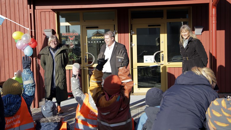 Den stora gården på Tjuvkils förskola lockar till lek och rörelse. Det är här som Miguel Odhner (S), kommunstyrelsens ordförande och Anna Vedin (M), ordförande i utskottet för bildning och lärande under högtidliga former klipper bandet. Därmed var kommunens nya förskola invigd. Förskolan öppnade sina dörrar redan i januari, men personalen valde att vänta med en invigning. Allt för att helt rikta in sig på att få till en bra start för barnen.