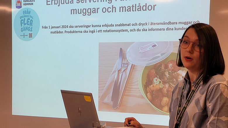 Först ut var miljöingenjör Marie Feser som bland annat informerade om nya krav. Från 1 januari ska serveringar som erbjuder snabbmat och dryck göra detta i återanvändbara muggar och matlådor. Allt i syfte att minska nedskräpning och främja en cirkulär ekonomi. Produkterna ska ingå i ett rotationssystem, och detta ska kunden bli informerad om. Marie informerade också om det nya kravet på att matavfall måste separeras från förpackning.
