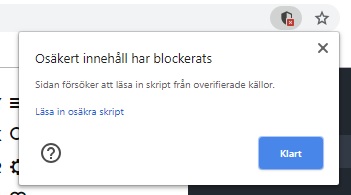Om du använder webbläsaren Google Chrome kan det hända att den felaktigt blockerar webbsädningen. Klicka då på den lilla skölden till höger i adressfältet och klicka på: Läs in osäkra script.