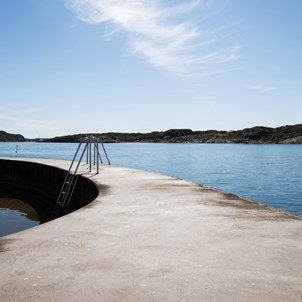 Bada på fantastiska Marstrand! Här finns badstegar, så att du lättare kan ta dig ett dopp i havet. När du har badat finns många möjligheter att äta på något av öns alla matställen.