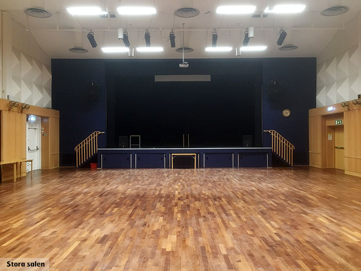 Den stora salen är 236 kvadratmeter och rymmer 260 sittande gäster i biosittning. Scenens mått är 10x6 meter. Kök finns och är gratis att hyra men ingår inte automatiskt vid en bokning. Du behöver specifikt uppge att du även önskar boka köket.
