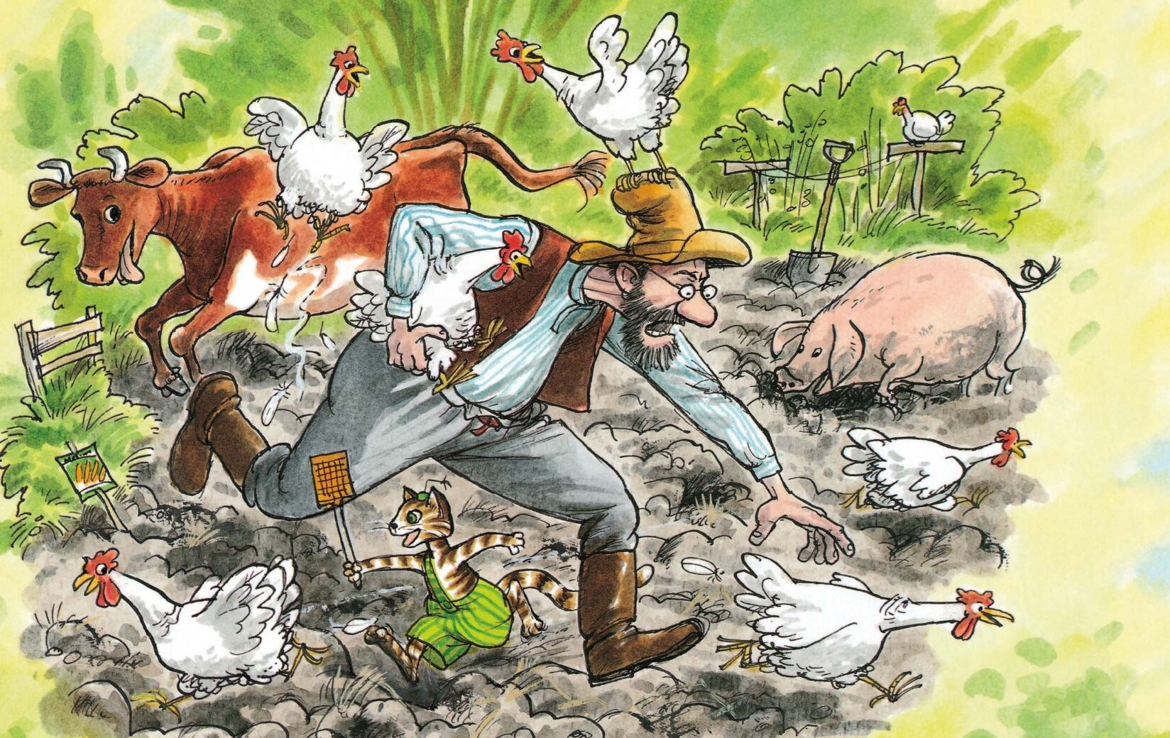 Pettson gör i ordning grönsakslandet men det är inte så lätt när hönsen