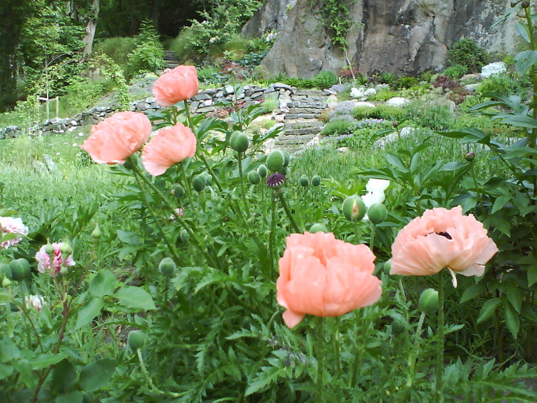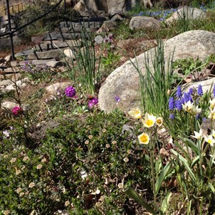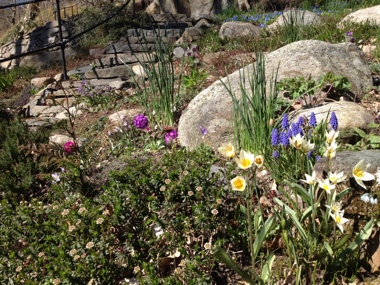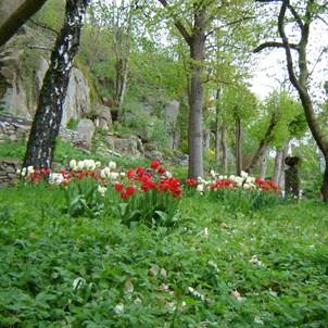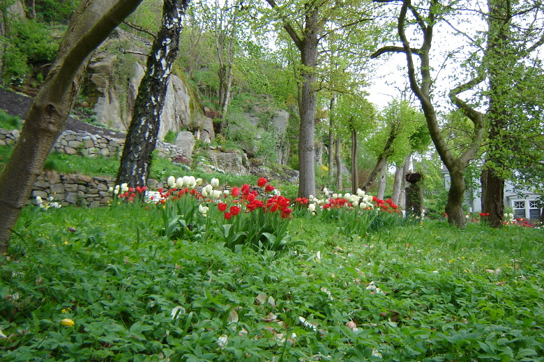 I nedre delen av anläggningen av trädgården finns blomsterrabatter och slingrande gångar. På försommaren möts du av en mängd lökväxter och blommande träd. Trädgården fortsätter med stentrappor upp till en utsiktsplats dit man kan gå och få en fin utsikt över älven.