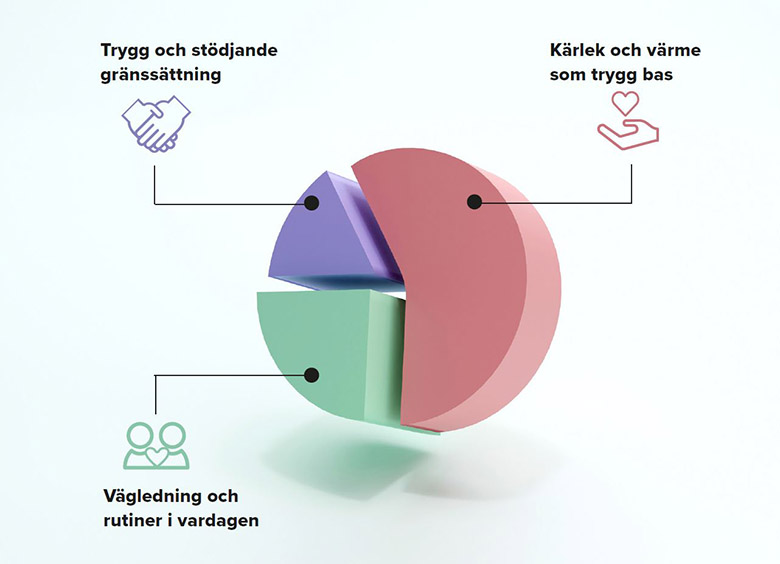 Det kan kännas som att det är mycket olika som en som förälder ska klara av och även om det är underbart kan det också kännas betungande ibland. Då kan det vara bra att hålla föräldraskapets tallriksmodell i tre delar i huvudet för att få balans i livet med sitt barn. För att ditt barn ska må bra, känna sig tryggt och utvecklas behöver det mest av kärlek och värme som en trygg bas i relationen. Andra viktiga saker är vägledning och rutiner och att sätta gränser. När vi föräldrar ser till att detta finns på tallriken blir vi en trygg bas för barnet. En bas för att utforska och upptäcka världen och en säker hamn för barnet att återvända till under hela livet.